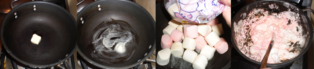 Melt the butter completely in a deep pan or pot on low heat. Toss in the marshmallows, and then cook and stir them until they become one big tasty goop (approx 5 minutes).