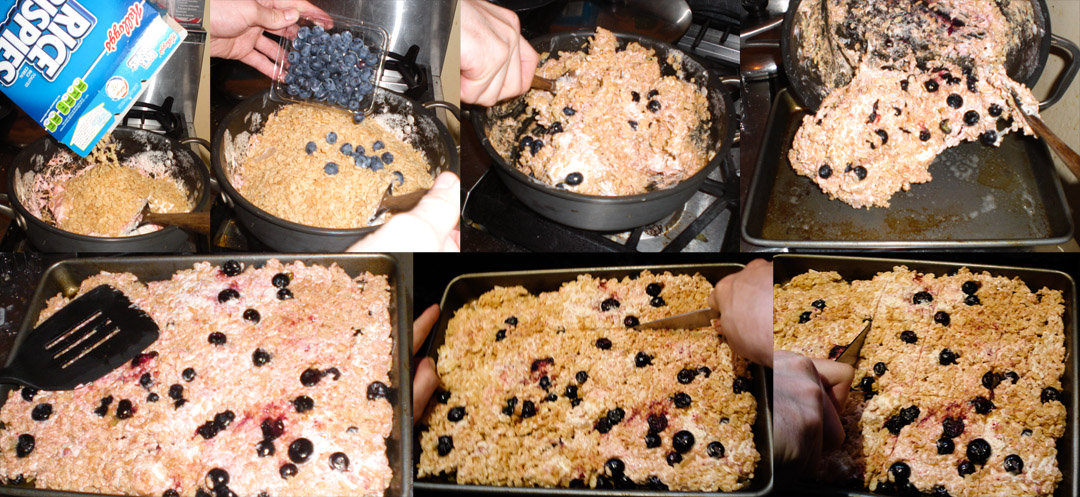 Turn the heat off and dump in the Krispies and blueberries. Mix them all together thoroughly. Dump them all into a greased baking pan, and pat them down with a spatula (ideally sprayed with cooking spray). Allow them time to cool (approx 30 minutes). Cut up your preferred sized squares and distribute to the beautiful people.