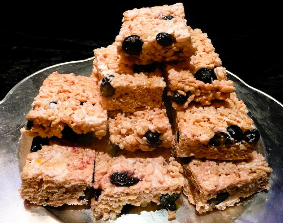 Your favorite childhood treat is back with a black and blueberry attitude. This ain’t your momma’s Rice Krispie Treat. The team of molecular physicists on staff at COOK TO BANG developed a groundbreaking improvement to this noble confectionery. The naysayers who said our research grant money was worse spent than Sarah Palin’s Bridge To Nowhere can suck it. Now that haters are off to ruin someone else’s day, behold: I reveal to you the revolutionary Krispie Treat supercharged with blueberry bomb blasts. The consumer will be too busy rolling their eyes into the back of their heads to notice the antioxidants going to work. Serve these treats to someone you’re sweet on in full confidence that you’re holding your conquest’s health in the utmost regard. It’s low in fat, rich in fiber, and overflowing with awesomeness. Keep in mind you’ll have plenty of leftovers that are great for post-coital snacks or to lure future dates to your place. No blue balls for you, my friend!