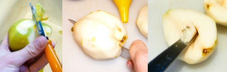 Peel, halve, and core the pears.