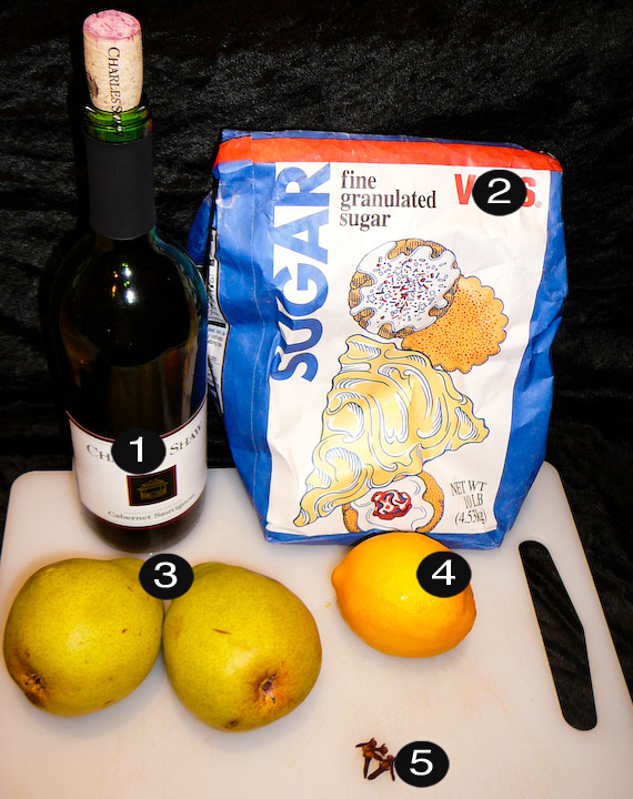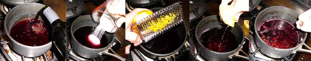 On med-low heat, pour in the wine and sugar. Zest the lemon and squeeze in the juice. Toss in the cloves. Bring to a boil, and then lower heat to a simmer.