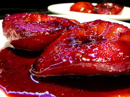 Some desserts inspire you to moan with pleasure. Others make you close your eyes and take in all the flavors. But there are some desserts so damn tasty that your underwear disappears. Meet these Frenchy French poached pears sure to set back the Celebrities Keep Your Panties On Organization a decade. As soon as the herpes harpies like Lindsay, Britney, and Paris take a bite, the upskirt paparazzi patrol will be out in force. My apologies for exposing the world to such villainy. But alas, you can use this dessert as a powerful Hail Mary in your arsenal when your date is resisting your bang campaign. Warning: Side effects will include your underwear vanishing too.