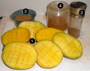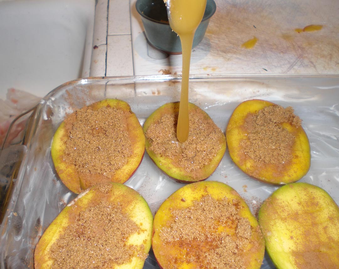 Add the brown sugar, cinnamon and honey into the holes where the mango pits were.