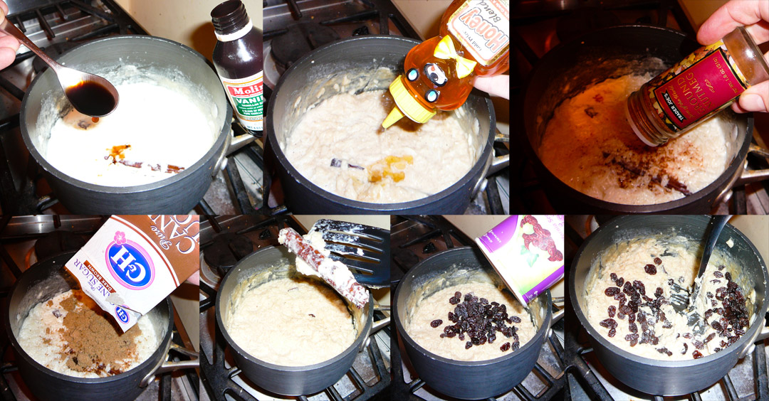 Turn off the heat and add the vanilla, honey, nutmeg, brown sugar. Turn the heat back on and cook until the pudding thickens (approx 10 min). Remove the cinnamon stick and mix in the raisins.