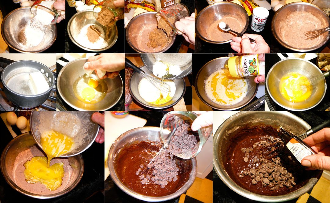 Preheat your oven to 375°F/190°C. Sift together 3/4 cups flour, cocoa mix, 3/4 cups brown sugar, salt and 1/4 tsp baking powder. Melt 1 stick of butter and beat in 2 eggs, and 1tsp vanilla extract. Mix the eggs/butter combination with the dry cocoa/flour/sugar mix into a batter. Blend in the chocolate chips and you have mind-blowing batter that you can bake or lick off your date.