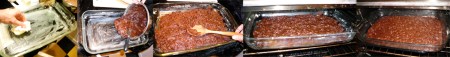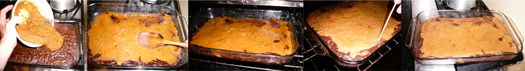 Grease a large baking pan and spread the brownie batter flat. Bake solo until the brown batter begins to harden (approx 25 min).