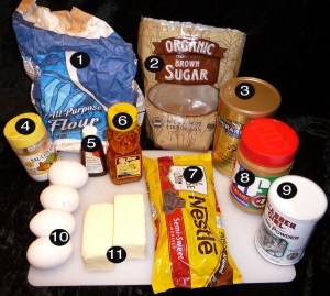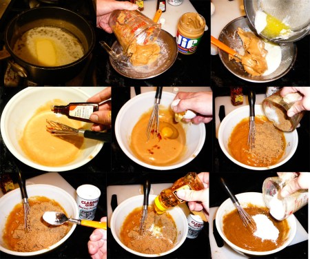 Melt the remaining stick of butter and mix with the peanut butter. Mix in the remaining 2 eggs and 1 tsp vanilla. Next mix the 1/4 tsp baking powder, honey, and 2 cups brown sugar. Finally mix in the 1 1/4 cups flour.
