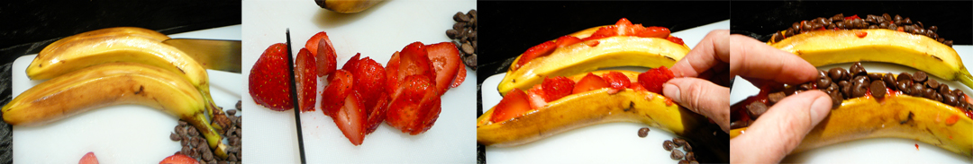 Preheat the oven to 350°F/175°C. Slice open the top of the banana all the way through to split the meat. Slice the strawberries thinly and stuff into the banana. Stuff the chocolate evenly with the strawberries.