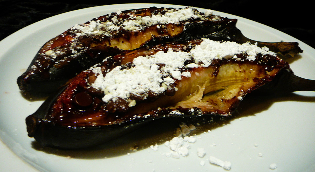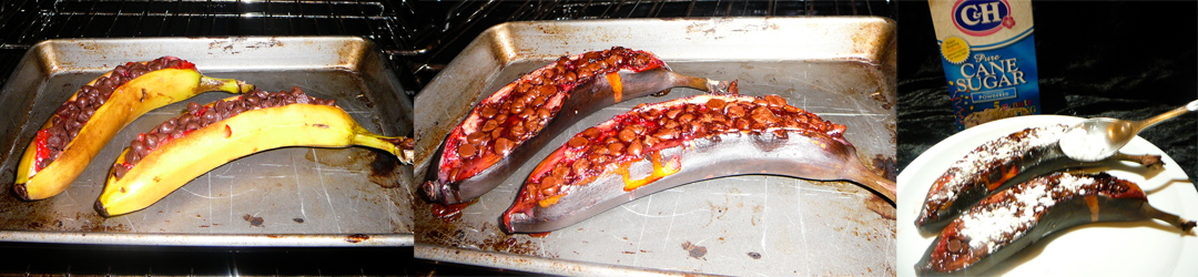 Throw the stuffed bananas into the oven and bake until the chocolate melts (approx 40 min). Remove from the oven and sprinkle some powdered sugar if you’re feeling it. Serve up with a spoon. Vanilla ice cream might go nicely with it.
