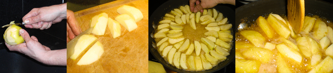 Peel the apples and away the cores.  Slice each apple into eights and place them in the caramelized sugar in a pinwheel fashion.  Allow the apples to cook down and caramelize, carefully flipping them over so they other side of the fruit gets the same sweet treatment (approx 15 minutes).  Turn off the heat.