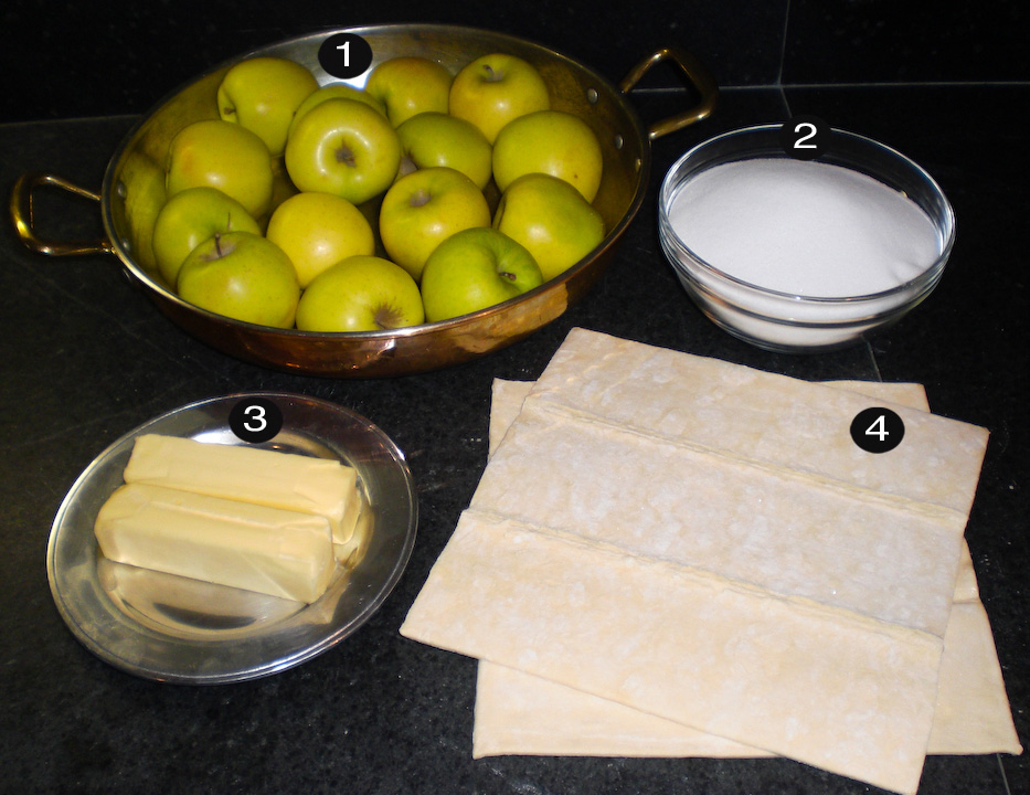 Preheat the oven to 425 degrees F.  Throw down a little flower to ensure the pastry puff doesn’t stick to the surface.  Roll out the pastry puffs using a rolling pin, wine bottle or other cylinder device.  Once you have a big enough pastry to cover the skillet, fold it over, and then spread it evenly over the skillet.  Use a wooden spoon or spatula to tear the edges off the pastry puff, and then stuff the edges into the apples.