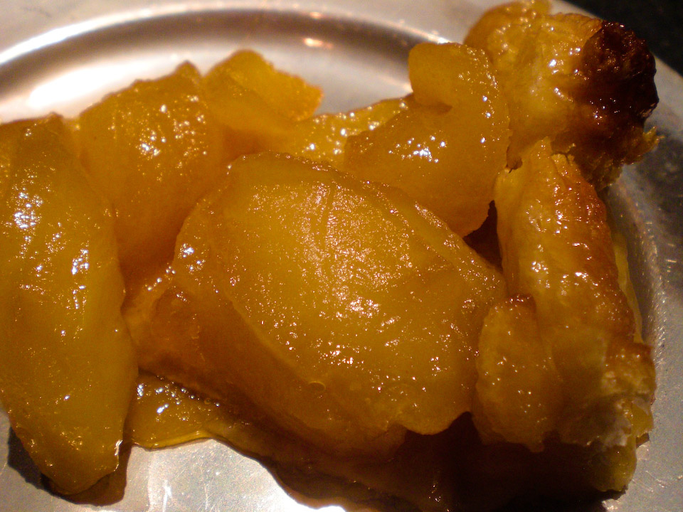 Throw the skillet into the oven and bake until the pastry puff browns (approx 20 minutes), checking occasionally and patting down the puff if it rises.  Once it is ready, immediately remove from oven and grab a pan or large plate that is equal or larger than the skillet and place it on top.  Quickly Flip the tart onto the new surface and allow it too cool (approx 30 minutes), resetting the apples evenly if need be.   While you wait for the tart tartin to cool, immediately clean the skillet so the caramelized sugar doesn’t harden, which is a bitch to clean.