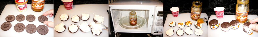 Lay out the Thin Mints. Put a tbsp of vanilla ice cream on each cookie. Heat up the caramel/butterscotch in the microwave or on the stove, and then drizzle a little on half the cookies. Finally press the cookies together like two lovers. Serve them like you mean it!
